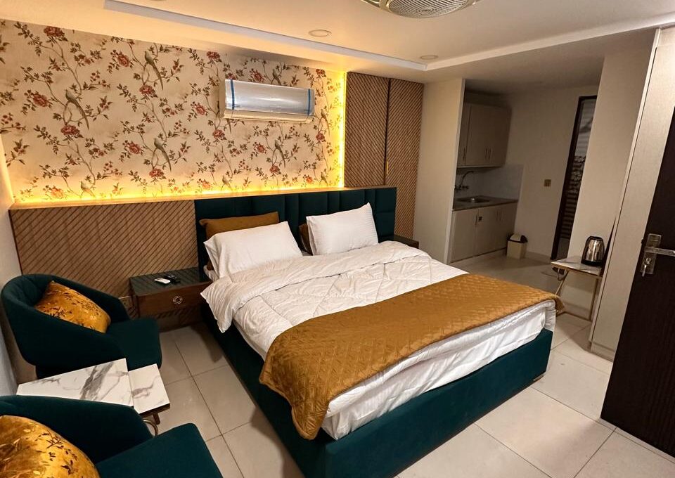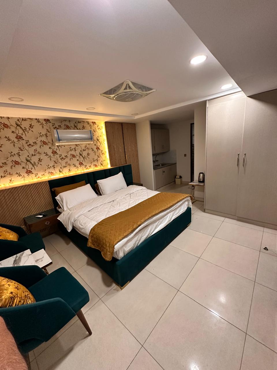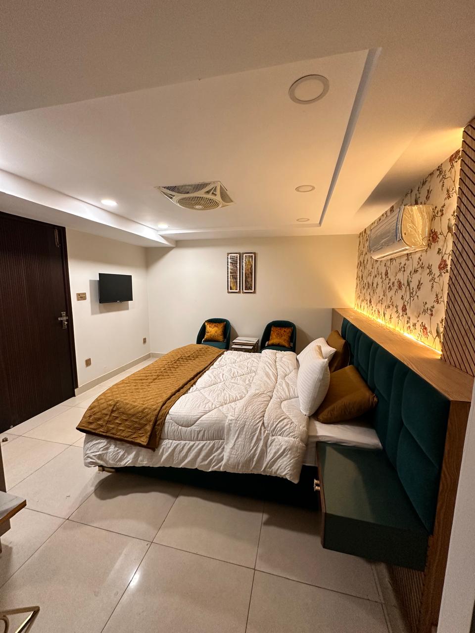 Experience luxury and comfort in our Premium King Room, featuring a king-sized bed with elegant floral décor, golden accents, velvet seating, flat-screen TV, AC, Wi-Fi, and a modern bathroom with walk-in shower.